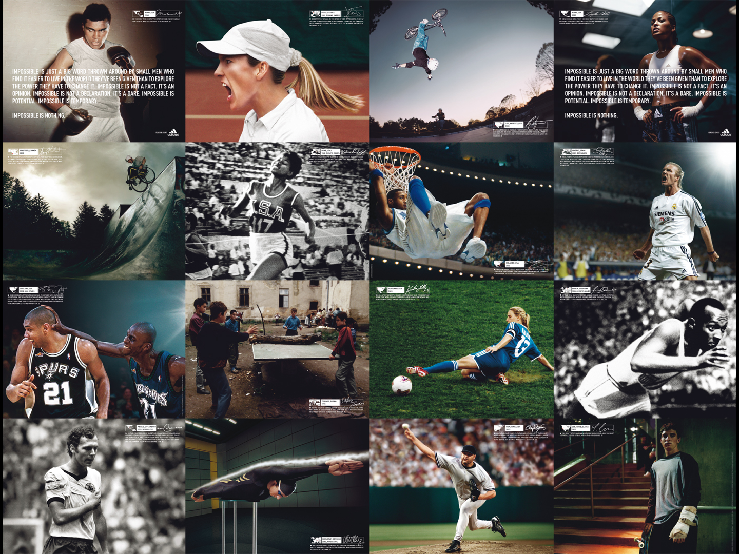 For the global Launch of „Impossible is Nothing“ at the 2004 Olympics in Athens, Greece we created the overall Print & Poster campaign design including photo art direction of the stars.